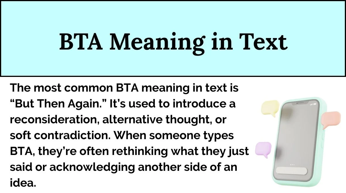 Across messaging and social platforms, the BTA meaning in text is overwhelmingly “But Then Again.” It’s a tone-softening phrase that shows reconsideration, flexibility, or second thoughts — making it perfect for digital conversation where emotional cues are limited.