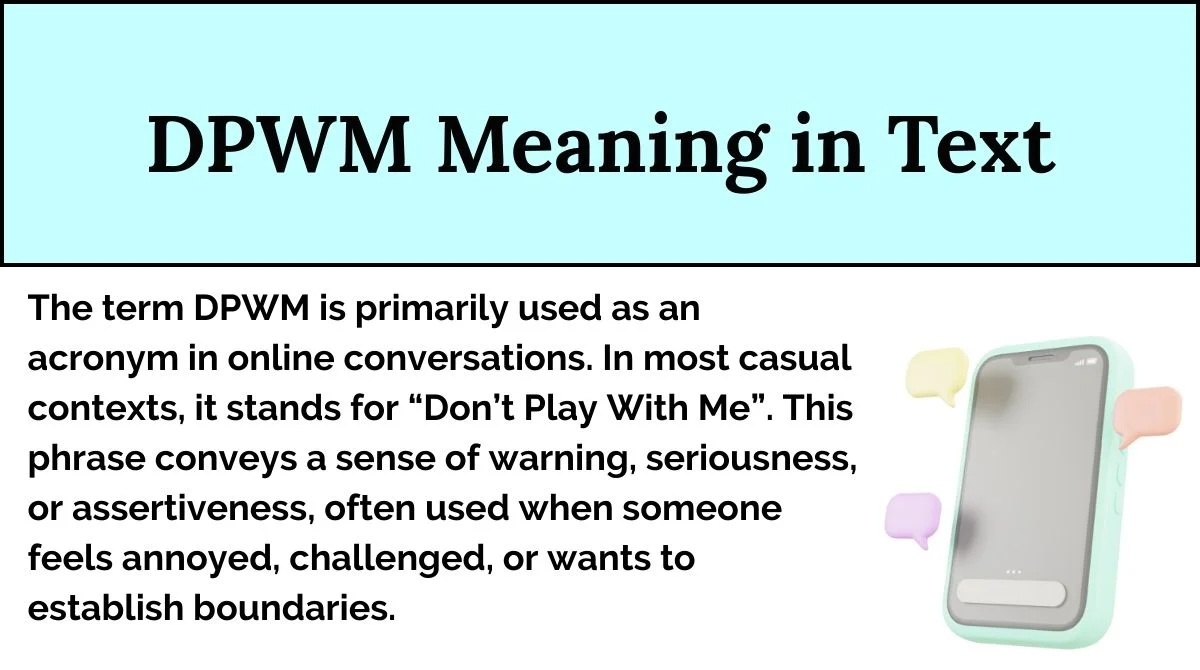 The term DPWM is primarily used as an acronym in online conversations. In most casual contexts, it stands for “Don’t Play With Me”. This phrase conveys a sense of warning, seriousness, or assertiveness, often used when someone feels annoyed, challenged, or wants to establish boundaries.