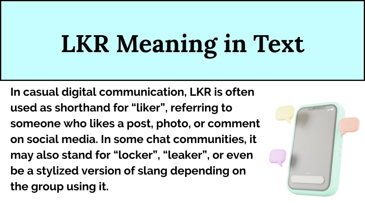 In everyday chats, LKR often appears as informal shorthand. Some users use it to mean “liker”, referencing someone who regularly likes posts or messages. In certain communities, it may represent an inside joke or group-specific slang. Here, tone and surrounding words usually make the meaning clear.
